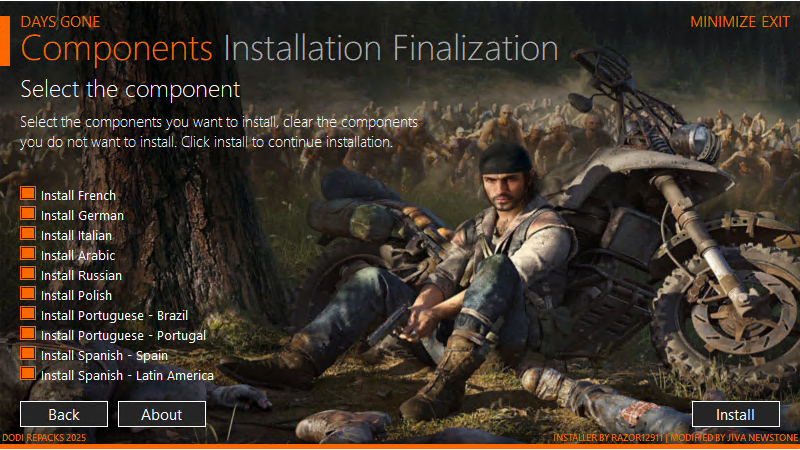 За основу взят релиз от RUNE (Days.Gone.Broken.Road-RUNE) Версия: v1.08 DLC: Broken Road Возможность не скачивать и не устанавливать и ненужные озвучки НИЧЕГО не вырезано, НИЧЕГО не перекодировано Время установки 3 - 10 минут Язык изменяется в настройках игры Английский язык включен по умолчанию Repack от DjDI
