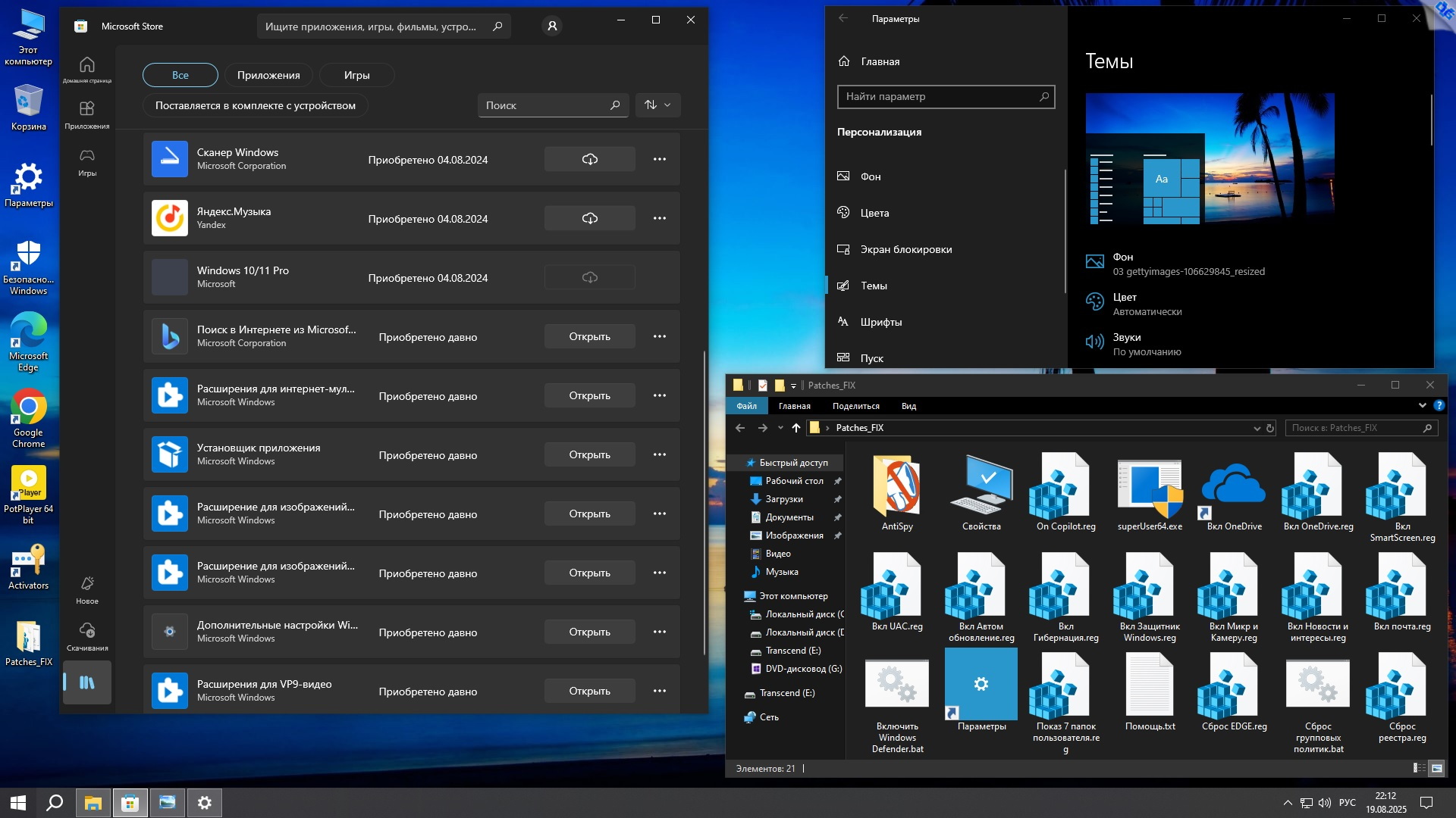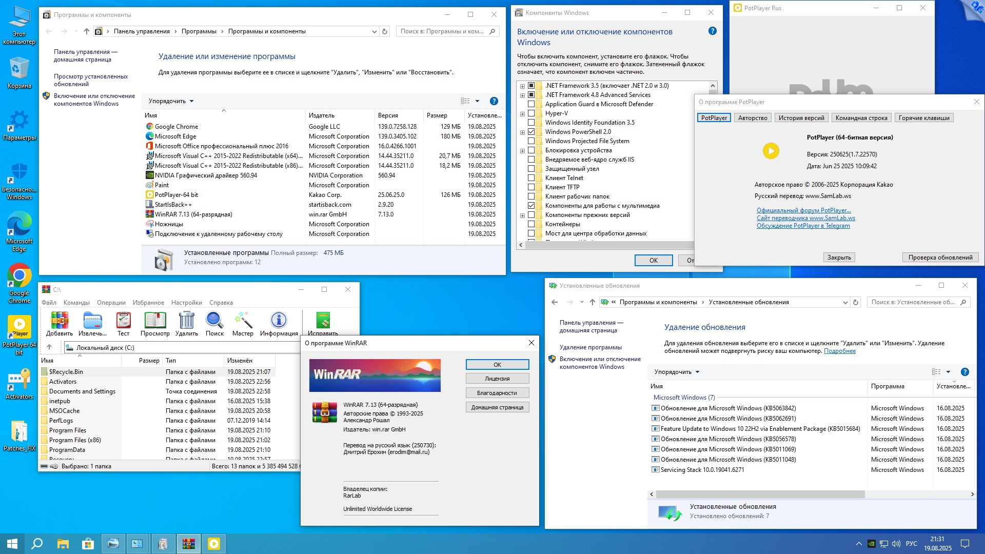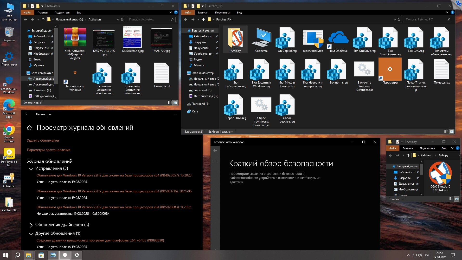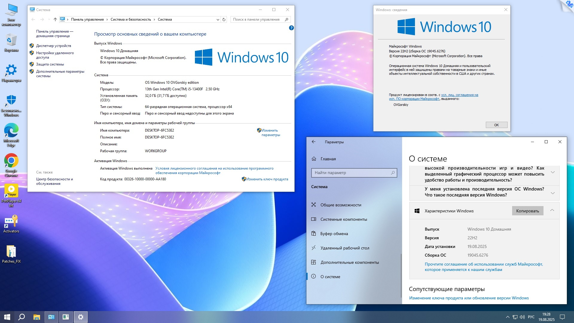 Microsoft® Windows® 10 Pro-Home Optim Plus x64 22H2 by OVGorskiy 08.2025 [RU] Год выпуска: август 2025 г. Версия: 10.0 build 19045 22H2 10.0.19045.6276. Адрес оф. сайта: © Microsoft 2025 Автор сборки: by OVGorskiy Язык интерфейса: Русский Разрядность: x64 Лекарство: в комплекте, KMS активатор или свой лицензионный ключ. Системные требования: ○ Процессор: Не менее 1 ГГц или SoC; ○ ОЗУ: 2 ГБ (для 64-разрядных систем), рекомендуется 4 ГБ; ○ Место на жёстком диске: 25 ГБ (для 64-разрядных систем), рекомендуется 36 ГБ; ○ Видеокарта: DirectX версии 9 или выше с драйвером WDDM 1.0 ○ Дисплей: 800 x 600 точек. Описание: оптимизированная облегчённая (LITE) сборка на основе оригинальных русских образов операционной системы Windows 10 x64 (64 бит.) 22H2 от Microsoft 2-х редакций, Профессиональная и Домашняя, объединённых в один установочный образ. В сборке произведена оптимизация системы для более комфортной работы с ней. Из системы удалены все плиточные Apps приложения, кроме магазина MicrosoftStore. Удалена в оптимальном режиме телеметрия и шпионские функции. Приостановлена работа не нужных служб. Удалены некоторые мало востребованные функции. Интегрированы классические программы для возврата в систему привычных нам кнопки и меню "Пуск", программа для работы с видео и звуковыми файлами, официальные дополнительные темы и картинки рабочего стола, обновления, основные компоненты Office 2016 и пр. Сборка предназначена для тех, кто желает получить почти готовую к применению систему, не обременённую ненужными функциями. Сборка даёт большие возможности по применению своих программ и приложений, а не навязанные корпорацией Microsoft и при этом имеет все возможности современной системы с оригинальным оформлением. Сборка прекрасно подходит как для игровых компьютеров, так и офисных. Название операционной системы: Microsoft® Windows® 10 22H2 Ru Версия ОС: 10.0 build 19045 22H2 (10.0.19045.6276) обновление август 2025 г. Состав сборки: Core Home (Домашняя), Professional (Профессиональная). Канал распространения: Retail (RET). Разрядность: 64 бит (x64). Дата выпуска: август 2025 г. Сборка основана на официальном образе MICROSOFT MSDN (Дата выпуска: октябрь 2022 г.): ru-ru_windows_10_consumer_editions_version_22h2_x64_dvd_86fd5014.iso Интегрированы: - обновления по 14 августа 2025 г. (накопительные); - компоненты .NetFramework 4.8.1 с обновлениями по август 2025 г.; - несколько официальных интересных тем из магазина, небольшой набор фоновых изображений. Автоматически устанавливаемые приложения в процессе установки ОС: ○ Microsoft Edge 139.0.3405.102 Corp., обновление Edge и замена Internet Explorer; ○ Google Chrome 139.0.7258.128 Corp., лучший браузер, альтернатива Edge и Internet Explorer; ○ Компоненты Office 2016 - Word, Excel, PowerPoint и Outlook; ○ StartIsBack++ 2.9.20, программа для возврата в систему привычных атрибутов ОС - меню "ПУСК" (см. примечания); ○ WinRAR v7.13, один из лучших архиваторов; ○ Daum PotPlayer v1.7.22569, один из лучших проигрывателей (См. Замечания); ○ Microsoft Visual C++ 2015-2022 Redistributable - 14.44.35211 x86-x64 (июнь 2025 г.). Windows 10 x64 Pro-Home Optim Plus 22H2 Ru by OVGorskiy 08.2025.iso CRC32: FE3429B2 MD5: 61D3B1B14B1042478BAB1FCD8369E30F SHA-1: 8113651776A8E6EA2C2A60AF026BC567629A6CA5 Размер iso образа: 5,54 ГБ (5 953 159 168 байт). - Установка операционной системы ничем не отличается от установки операционной системы с оригинала. При запросе ключа установки нажмите, "у меня нет ключа" либо воспользуйтесь своим лицензионным ключом. В процессе установки нужно выбрать редакцию системы, которую вы хотите установить. Время установки ОС немного дольше и варьирует от 20 до 60 минут в зависимости от мощности компьютера. Приложения устанавливаются методом post-install внутренним 