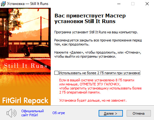 - Репак основан на ISO-образе Still.It.Runs-TENOKE: tenoke-still.it.runs.iso (6,274,850,816 байт)