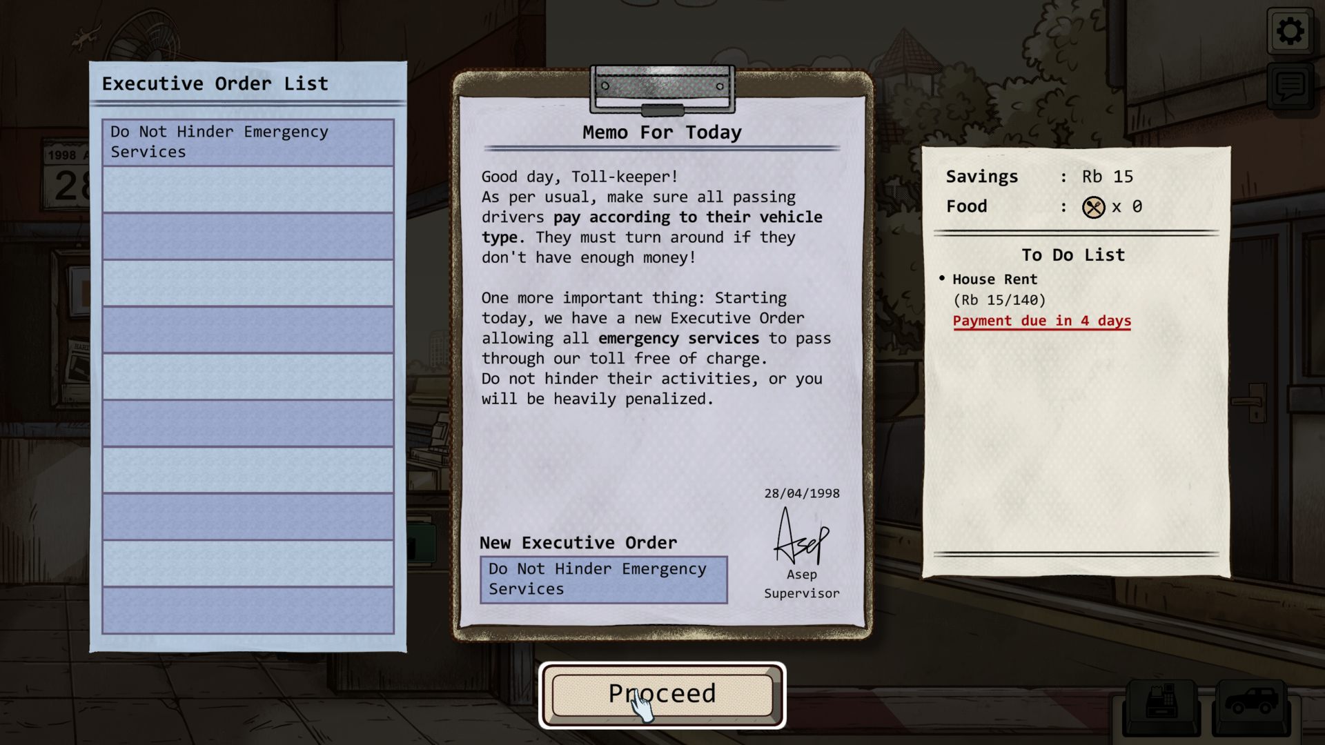 Perchik писал(а): "Papers, please" только с беременным контролёром? В принципе - да. С той разницей, что ГГ - не пограничник, а всего лишь контроллер на въезде на платную дорогу. Выполняешь в меру бредовые постановления начальства (типа того, что в четные дни могут проезжать только машины с четными цифрами в номерах) и пытаешься заработать деньги, решая некоторые моральные дилеммы.