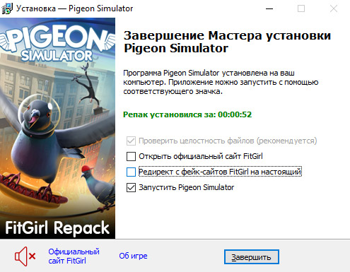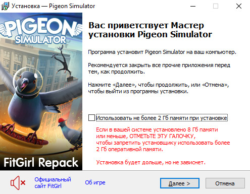 - Репак основан на ISO-образе Pigeon.Simulator-RUNE: rune-pigeon.simulator.iso (1,810,989,056 байт)