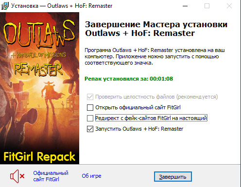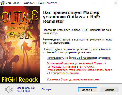 - Репак основан на ISO-образе Outlaws.Plus.Handful.of.Missions.Remaster-RUNE: rune-outlaws.plus.handful.of.missions.remaster.iso (4,548,362,240 байт)