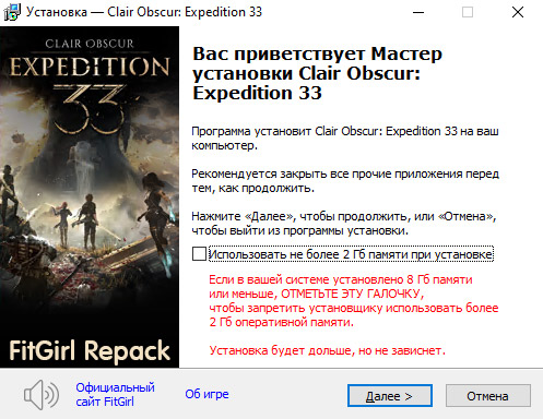 - Для установки репака требуется минимум 2 Гб свободной оперативной памяти (включая виртуальную)