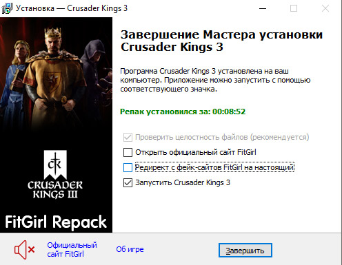 - После установки доступна опция проверки контрольных сумм всех файлов, чтобы убедиться, что репак установился нормально