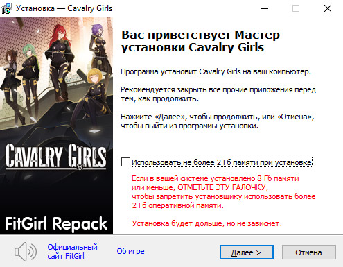- Репак основан на ISO-образе Cavalry.Girls.Red.Lotus-TENOKE: tenoke-cavalry.girls.red.lotus.iso (4,334,479,360 байт)