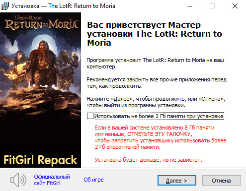 - Репак основан на ISO-образе The.Lord.of.the.Rings.Return.to.Moria.Durins.Folk-RUNE: rune-the.lord.of.the.rings.return.to.moria.durins.folk.iso (18,731,171,840 байт)