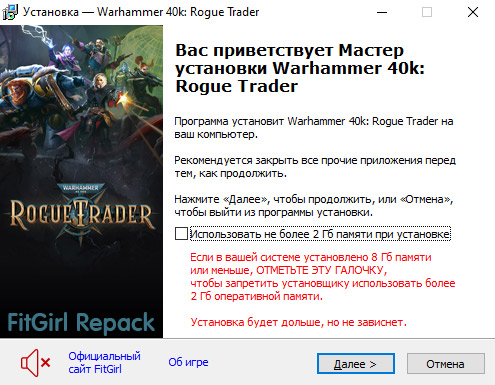 Warhammer 40,000: Rogue Trader - Voidfarer Edition v1.4.0.184 + 8 DLC/Бонусов Дата выпуска: 7 декабря 2023 Жанр: RPG, Isometric, 3D, Party-based, Turn-based Разработчик: Owlcat Games Издательство: Owlcat Games Движок: Unity Пользовательские оценки в Steam: 84% обзоров пользователей - положительные (22142 рецензии) Язык интерфейса: Русский, Английский, Французский, Немецкий, Испанский, Китайский (Упр.), Японский Язык озвучки: Английский Тип издания: Repack Лекарство: вшито (CODEX-RUNE) Системные требования: ОС: Windows 7 x64 и выше Процессор: Intel(R) Core(TM) i5-4590T CPU @ 2.00GHz и лучше Память: 8 Гб Видео: AMD Radeon RX Vega 6 / Intel HD Graphics 630 или лучше DirectX: 11 Место на диске: до 40.4 Гб