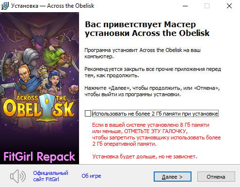 - Для установки репака требуется минимум 2 Гб свободной оперативной памяти (включая виртуальную)
