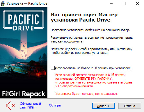 Pacific Drive: Ritual Edition v1.11.0-CL33018 + 6 DLC/бонусов Дата выпуска: 22 февраля 2024 Жанр: Action, Driving, Survival, First-person, 3D Разработчик: Ironwood Studios Издательство: Ironwood Studios Движок: Unreal Engine 4 Пользовательские оценки в Steam: 83% обзоров пользователей - положительные (17924 рецензии) Язык интерфейса: Русский, Английский, Французский, Немецкий, Испанский, Японский, Корейский, Китайский (Упр.), Китайский (Трад.), Польский, Бр. Португальский, Турецкий Язык озвучки: Английский Тип издания: Repack Лекарство: вшито (CODEX-RUNE) Системные требования: ОС: Windows 10 x64 и выше Процессор: Intel Core i5 8600 и лучше Память: 16 Гб Видео: Nvidia GTX 1060 6GB или лучше DirectX: 11 Место на диске: 25 Гб (29.1 Гб на время установки репака)