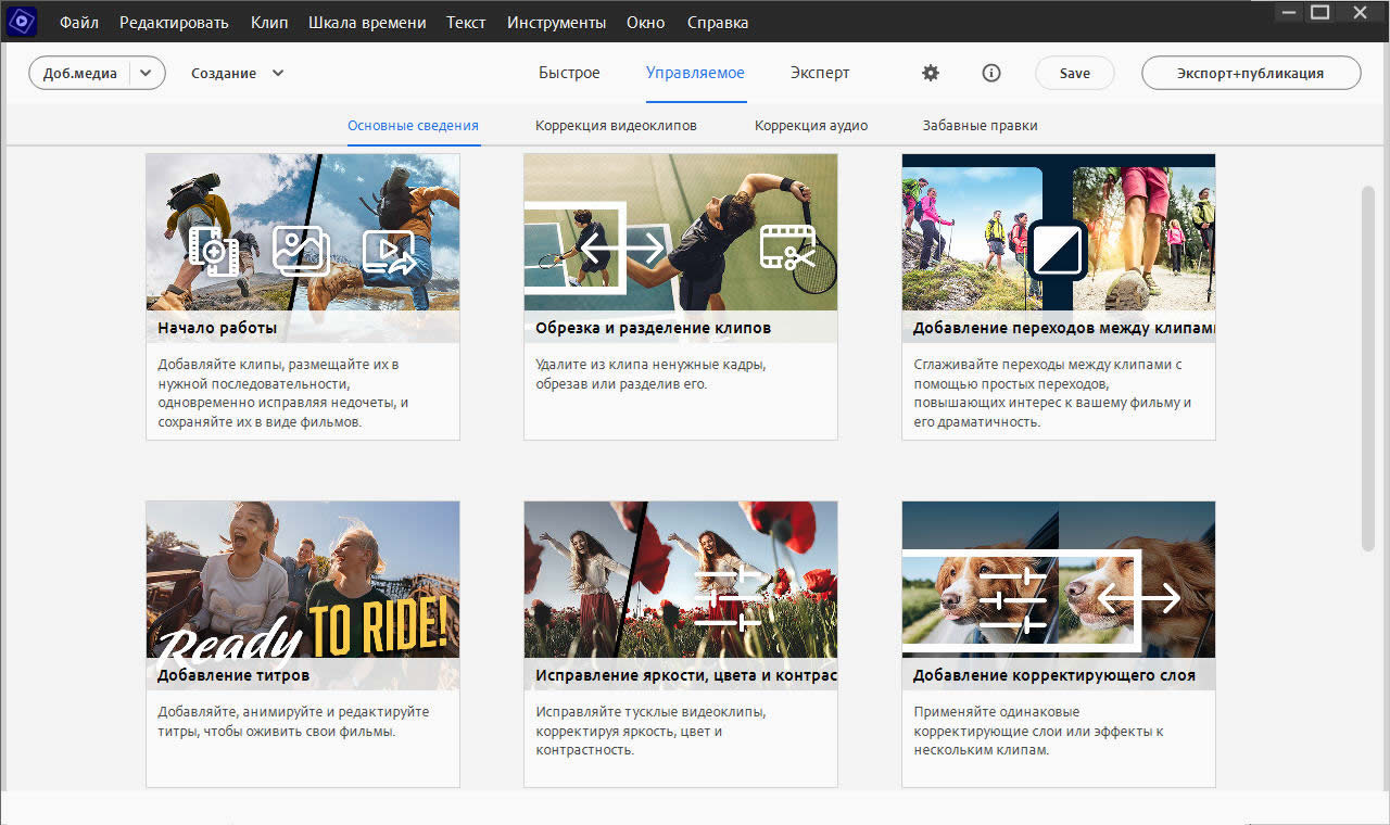 Adobe Premiere Elements, специальными эффектами и встроенными подсказками, чтобы превращать свои видеоклипы в захватывающие фильмы, которые поразят друзей и родных. Публикуйте видео любыми удобными способами.