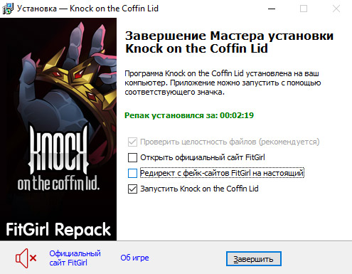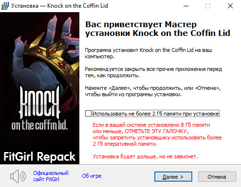 - Репак основан на ISO-образе Knock.on.the.Coffin.Lid.v1.3.9.0-TENOKE: tenoke-knock.on.the.coffin.lid.v1.3.9.0.iso (22,843,203,584 байта)