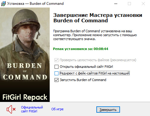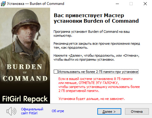 - Репак основан на ISO-образе Burden.of.Command.v1.0.84-TENOKE: tenoke-burden.of.command.v1.0.84.iso (9,063,862,272 байта)