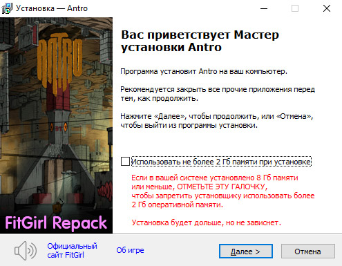 - Для установки репака требуется минимум 2 Гб свободной оперативной памяти (включая виртуальную)