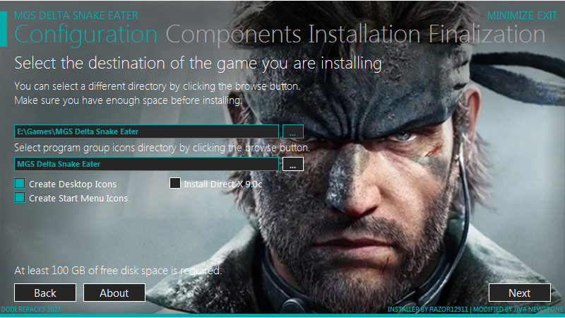 ・GUY SAVAGE Δ *Режим GUY SAVAGE Δ открывается после прохождения игры. За основу взят релиз от FLT (METAL_GEAR_SOLID_DELTA_SNAKE_EATER-FLT) Версия игры: v1.1.1 DLC: Sneaking DLC Pack НИЧЕГО не вырезано, НИЧЕГО не перекодировано Время установки: 30 - 90 минут Язык изменяется в настройках игры Repack от DjDI 1- Запустите программу установки от имени администратора 2- Нажмите на страницу 3- Нажмите стрелку вверх на клавиатуре 4- Нажмите Установить 5- Нажмите Продолжить 6- Выберите пункт назначения установки 7- Нажмите Далее 8- Выберите компонент 9- Установить