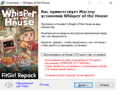 - Репак основан на ISO-образе Whisper.of.the.House-TENOKE: tenoke-whisper.of.the.house.iso (1,694,109,696 байт)