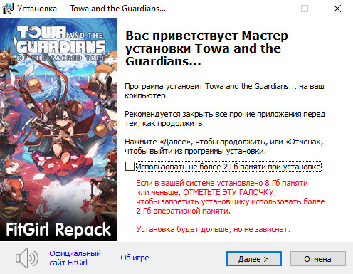 - Репак основан на ISO-образе Towa.and.the.Guardians.of.the.Sacred.Tree-RUNE: rune-towa.and.the.guardians.of.the.sacred.tree.iso (6,304,038,912 байт)