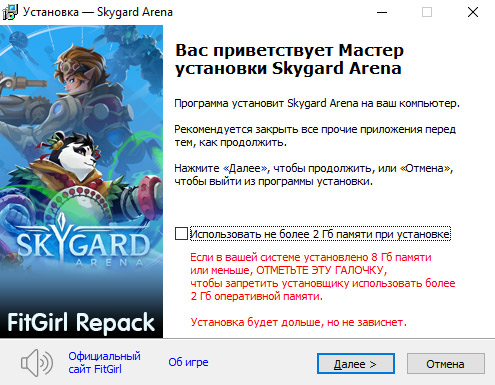 - Репак основан на ISO-образе Skygard.Arena-TENOKE: tenoke-skygard.arena.iso (7,145,879,552 байта)