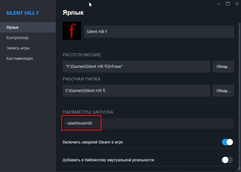 "F:\Games\Silent Hill f\SHf.exe" -savetouserdir