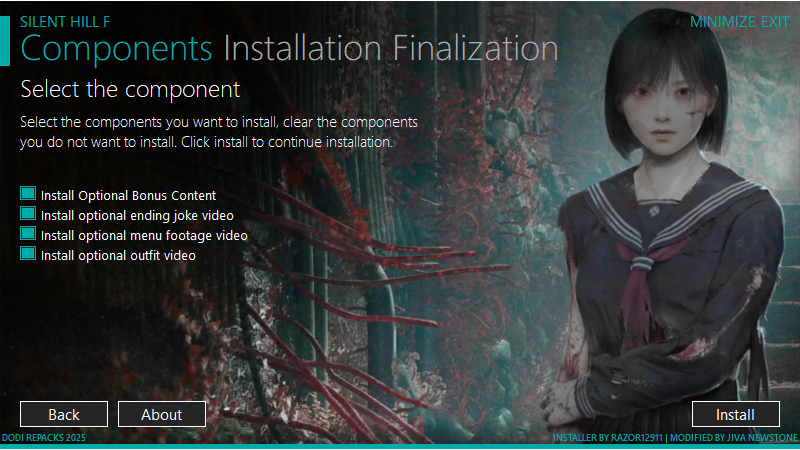 Ваше первое прохождение закончится предопределенным финалом, но, начиная со второго прохождения, от вашего выбора будет зависеть исход игры. Всего в игре пять концовок — возвращайтесь к ней снова и снова, чтобы полностью раскрыть истину, окутанную тайной. За основу взят релиз от RUNE (SILENT.HILL.f-RUNE) Версия игры: v1.1.378720 DLCs 3282160=SILENT HILL f – White Sailor School Uniform 3282170=SILENT HILL f – Item Pack 3282180=SILENT HILL f – Pink Rabbit Costume 3282190=SILENT HILL f – Omamori: Peony 3282720=SILENT HILL f – Bonus Content 3320040=SILENT HILL f – Digital Soundtrack 3516200=SILENT HILL f – Digital Deluxe Upgrade Bonus Content: Artbook & Soundtrack Возможность не скачивать и не устанавливать Bonus Content (Soundtrack & Artbook) & дополнительные игровые видеоролики НИЧЕГО не вырезано, НИЧЕГО не перекодировано Время установки 10 - 30 минут Язык изменяется в настройках игры Repack от DjDI 1- Запустите программу установки от имени администратора 2- Нажмите на страницу 3- Нажмите стрелку вверх на клавиатуре 4- Нажмите Установить 5- Нажмите Продолжить 6- Выберите пункт назначения установки 7- Нажмите Далее 8- Выберите компонент 9- Установить