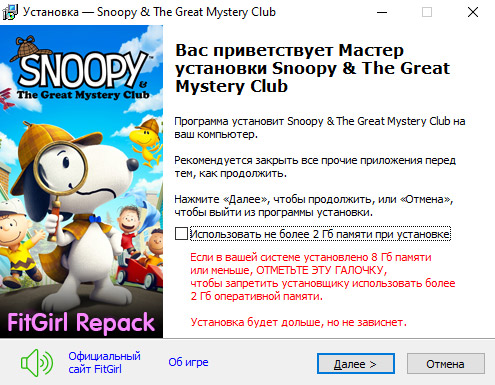 - Репак основан на ISO-образе Snoopy.And.The.Great.Mystery.Club-TENOKE: tenoke-snoopy.and.the.great.mystery.club.iso (9,014,185,984 байта)