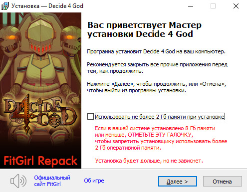 - Для установки репака требуется минимум 2 Гб свободной оперативной памяти (включая виртуальную)