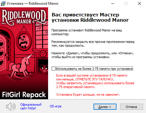 - Репак основан на ISO-образе Riddlewood.Manor-TENOKE: tenoke-riddlewood.manor.iso (4,703,430,656 байт)