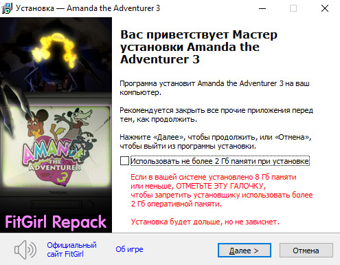 - Репак основан на ISO-образе Amanda.the.Adventurer.3-TENOKE: tenoke-amanda.the.adventurer.3.iso (12,348,403,712 байт)