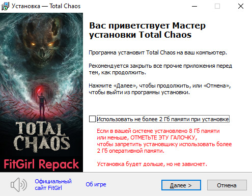 - Для установки репака требуется минимум 2 Гб свободной оперативной памяти (включая виртуальную)