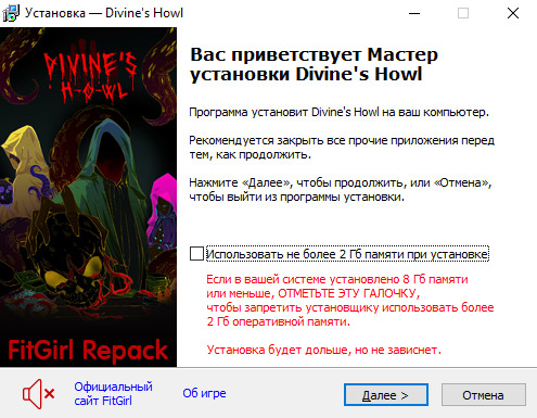 - Репак основан на ISO-образе Divines.Howl-TENOKE: tenoke-divines.howl.iso (2,639,335,424 байта)