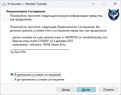 - релиз основан на сцен-релизе игры от SKIDROW (sr-randalstuesday.iso)