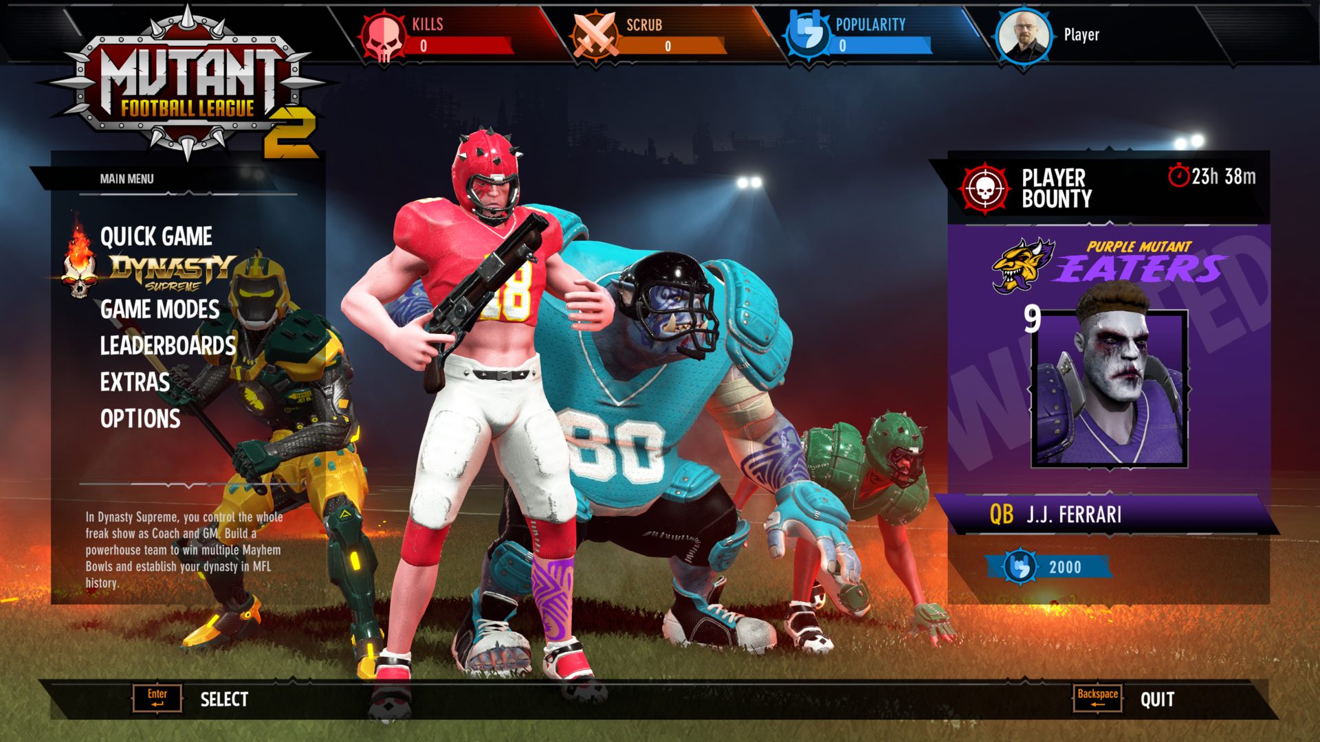 - Династия Supreme - Стань главарём этого фрик-шоу в режиме франшизы MFL2. Начни на дне лиги и когтями карабкайся вверх, становясь профессионалом, побеждая соперников на протяжении нескольких сезонов и выигрывая Mayhem Bowls. Каждый сезон набирай новичков на драфте и тренируй их, чтобы построить мощный состав.
