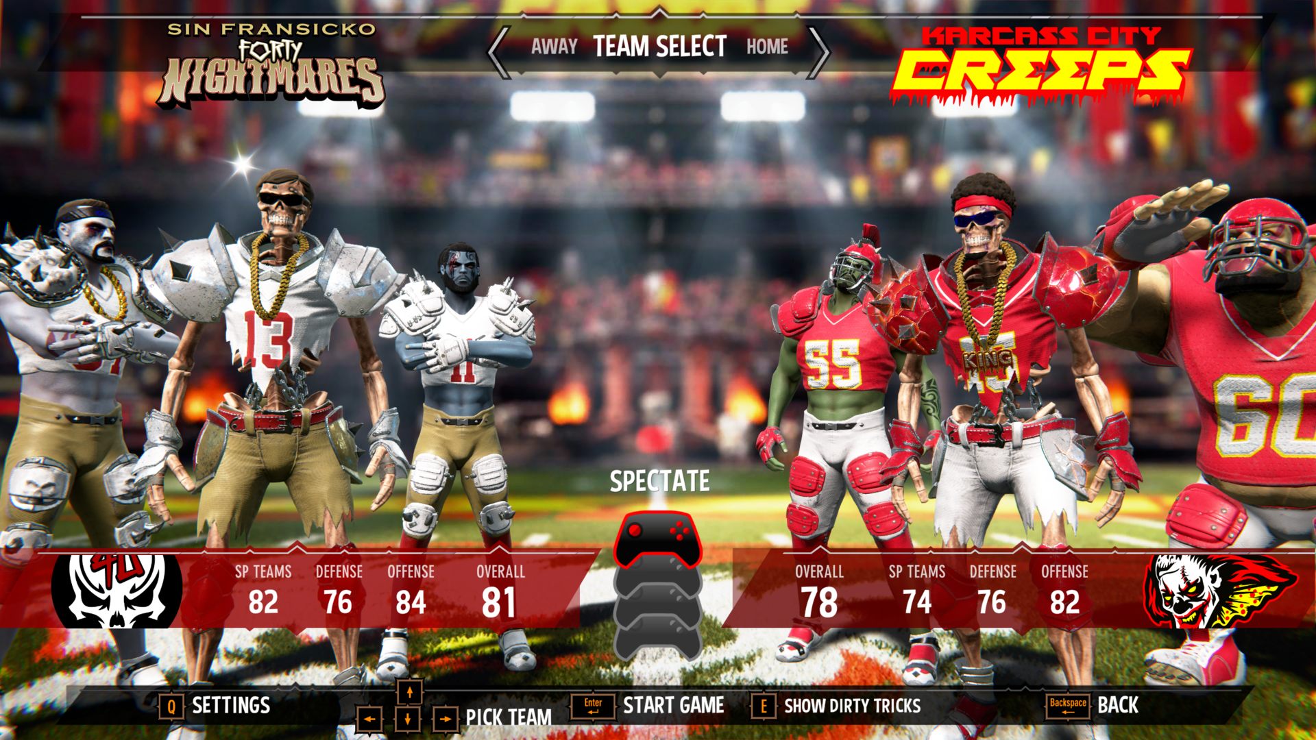 - Монстр-сквад - Выбирай из более чем 36 команд MFL, состоящих из безумных мутировавших версий звёзд профессионального футбола - 32 команды большой лиги, такие как Karcass City Creeps, Killadelphia Evils и Blitzburgh Steelheads, а также 4 команды малой лиги, вроде Orcs of Hazards и Tokyo Terminators. Игроки, открытые через карточки MFL, включают в себя исторических звезд, которых можно подписать в режиме свободных агентов. Ну а если хочешь быть уникальным снежинкой - создай собственную команду и построй свою легенду.