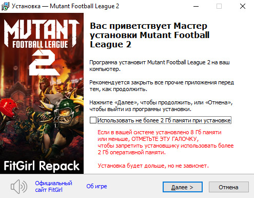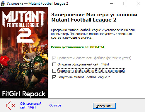 - Репак основан на ISO-образе Mutant.Football.League.2-RUNE: rune-mutant.football.league.2.iso (6,268,026,880 байт)