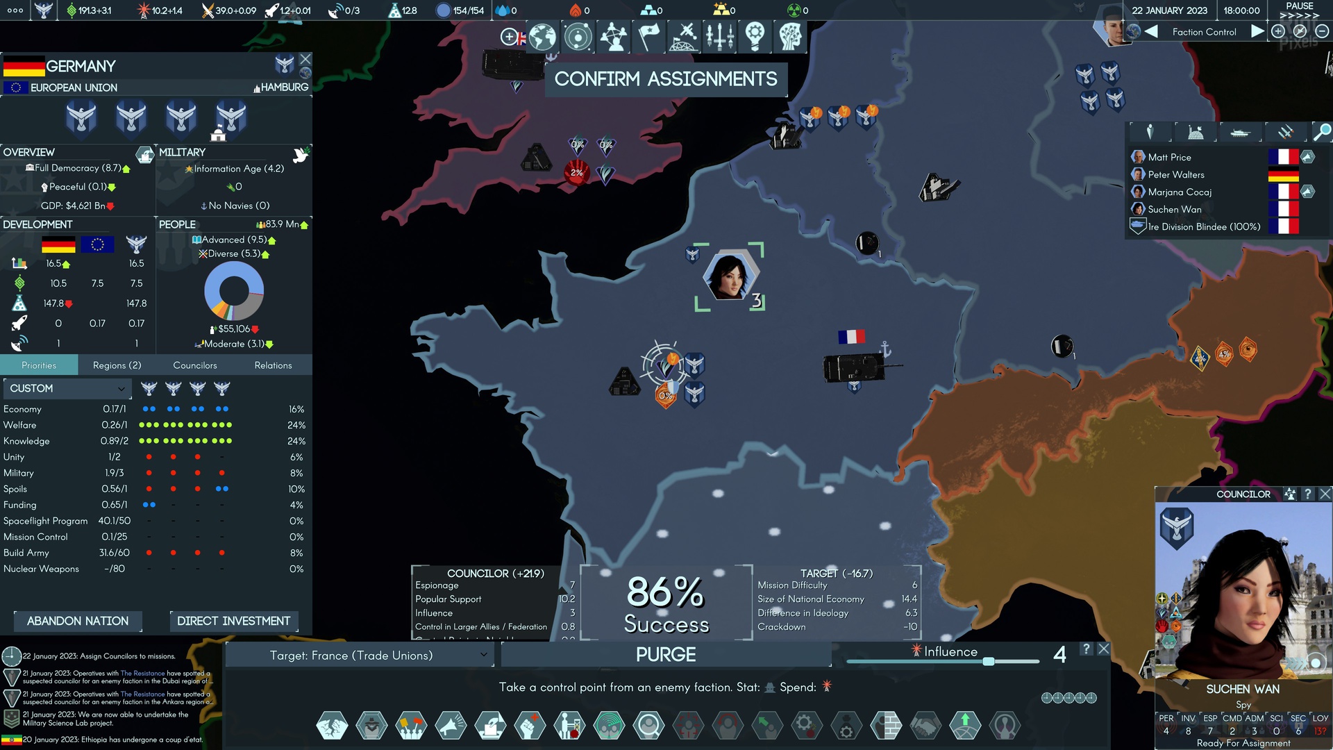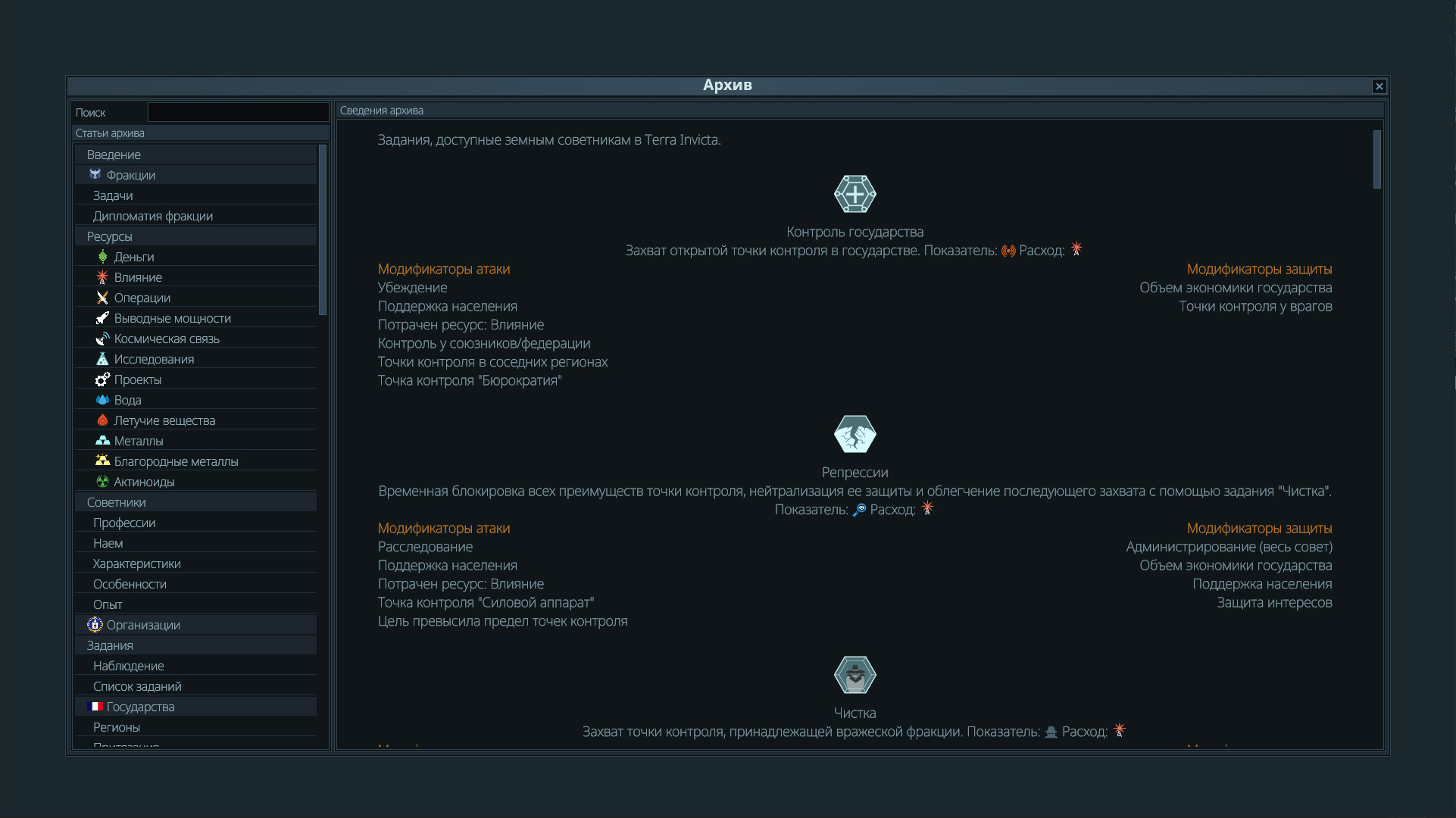 • БОРЬБА ЗА ВЛАСТЬ - Вы начинаете игру на Земле в роли предводителя одной из тайных организаций, придерживающейся выбранной вами идеологии. Инопланетяне приближаются, и скоро они будут здесь, но пока что вашими главными врагами (а может быть, и союзниками) станут другие земные фракции. Вместо нации, сформированной территорией, на которой она проживает, вы руководите группой людей, добровольно объединенных общей идеологией. Это важное отличие от большинства стратегических игр: в Terra Invicta перед вами не стоит цель раскрашивать карту в цвета того или иного народа. Вместо этого, вам предстоит действовать в тени, соперничая с другими фракциями за контроль над точками, представляющими военную, экономическую и политическую силу региона. Геополитика - ваша песочница: объединяйте или разделяйте целые нации ради собственной выгоды и используйте подвластные вам народы, чтобы вести прокси-войны с другими фракциями. Каждый регион Земли проработан до мелочей с учетом всех нюансов: от уровня образованности населения и народных волнений до ВВП и социального неравенства. Заполучив контроль над регионами, имеющими финансовое и военное влияние, вы сможете установить свою власть на Земле, но, если не захватить регионы с ракетными полигонами и стартовыми комплексами, войну за Солнечную систему вам не выиграть. Вершите свою волю руками политиков, ученых и агентов, которых вы сможете рассылать по всему миру (и даже отправлять в космос). По мере того, как ваши подручные будут набираться опыта и устанавливать контроль над влиятельными организациями вроде разведывательных агентств и богатых корпораций, их стартовые способности будут развиваться. Закаленный в боях командир сможет более эффективно направлять свой тактический отряд, а опытный дипломат приложит все усилия, чтобы добиться финансирования проекта по противодействию инопланетному вторжению. Ищите единомышленников среди политиков и народных масс и предпринимайте необходимые действия, чтобы склонить приверженцев других идеологий на свою сторону. Общественное мнение имеет множество различных координат: Слуги с их поклонением пришельцам и Протекторат, готовящийся к капитуляции, могут иметь общие точки соприкосновения в плане поддержки инопланетян или противодействия им, в то время как события, которые показывают, что захватчиков можно уничтожить, способны убедить сторонников Протектората в том, что сопротивление оправдано и имеет смысл.