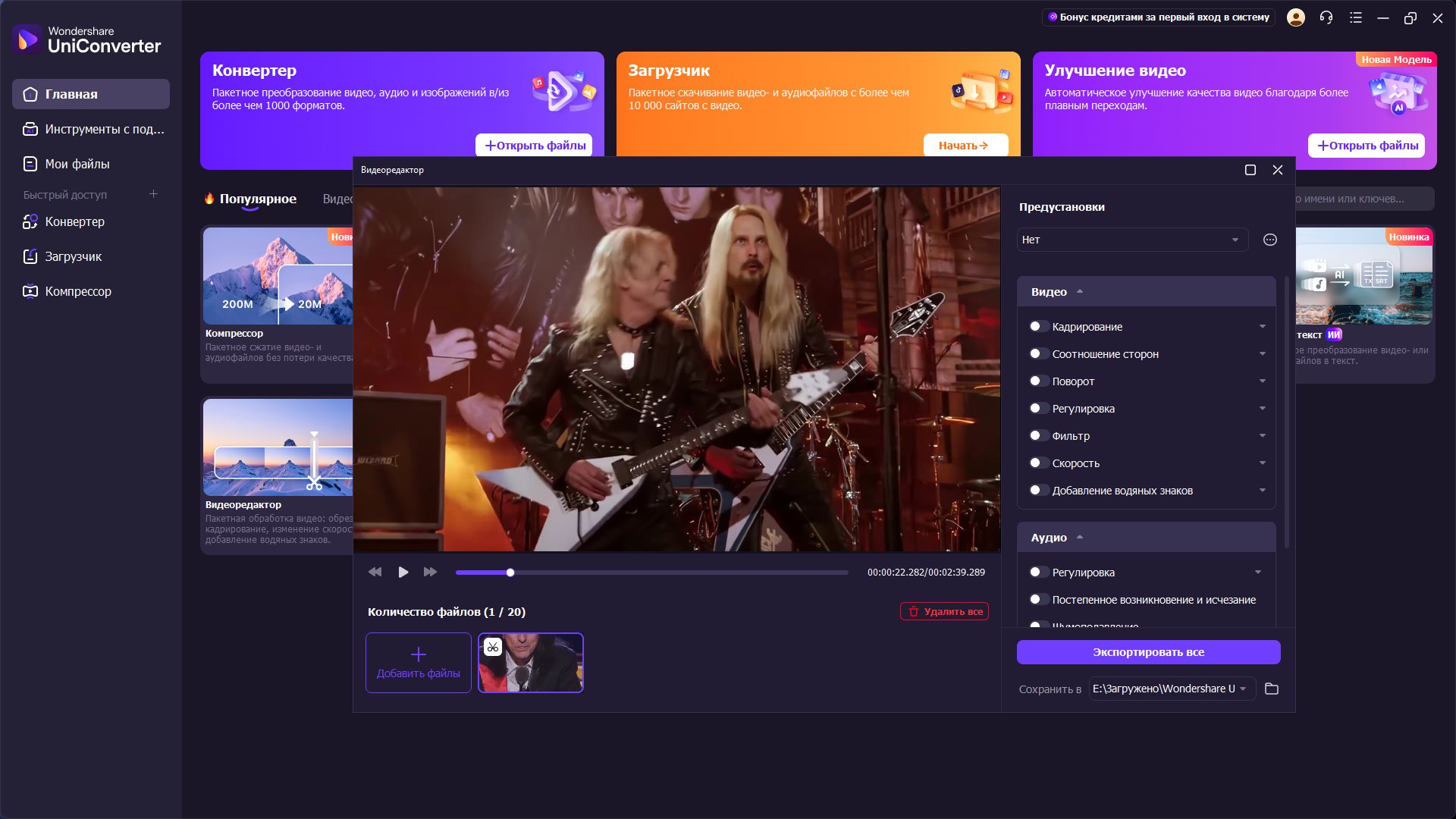 Wondershare UniConverter - простой в использовании видеоконвертер, с помощью которого вы легко можете конвертировать, редактировать, увеличивать, скачивать, записывать на диск, организовывать, захватывать видеосигнал и просматривать в более чем 159 форматах.