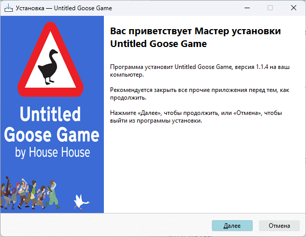 ОБЩАЯ ИНФОРМАЦИЯ: Год выпуска: 20 сентября 2019 г. Жанр: Экшены, Инди Разработчик: House House Издательство: Panic Тип издания: пиратка Версия: 1.1.4 Язык интерфейса: русский, английский, французский, итальянский, немецкий, испанский, японский, корейский, польский, бр. португальский, чешский, нидерландский, турецкий, китайский (упр.) Язык озвучки: отсутствует Таблетка: не требуется (DRM-Free) СИСТЕМНЫЕ ТРЕБОВАНИЯ: МИНИМАЛЬНЫЕ 64-разрядные процессор и операционная система ОС: Windows 7 SP1 и выше (64-разрядная) Процессор: Intel Core i5 6600+ / AMD Ryzen 3 1300+ Оперативная память: 8 ГБ ОЗУ Видеокарта: с поддержкой DX10 (Shader Model 4) DirectX: версии 10 Место на диске: 1 ГБ ОПИСАНИЕ: Untitled Goose Game — это эксцентричная забавная стелс-буффонада без жесткого сценария, где вы управляете гусем, тиранящим мирную деревню. Вы перемещаетесь по поселку, из частных дворов в магазины на главной улице и парки, устраивая розыгрыши, воруя шляпы и портя всем настроение.