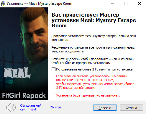 • Репак основан на ISO-образе Meal.Mystery.Escape.Room-TiNYiSO: tn-mealmysteryescaperoom.iso (3,832,584,192 байта)