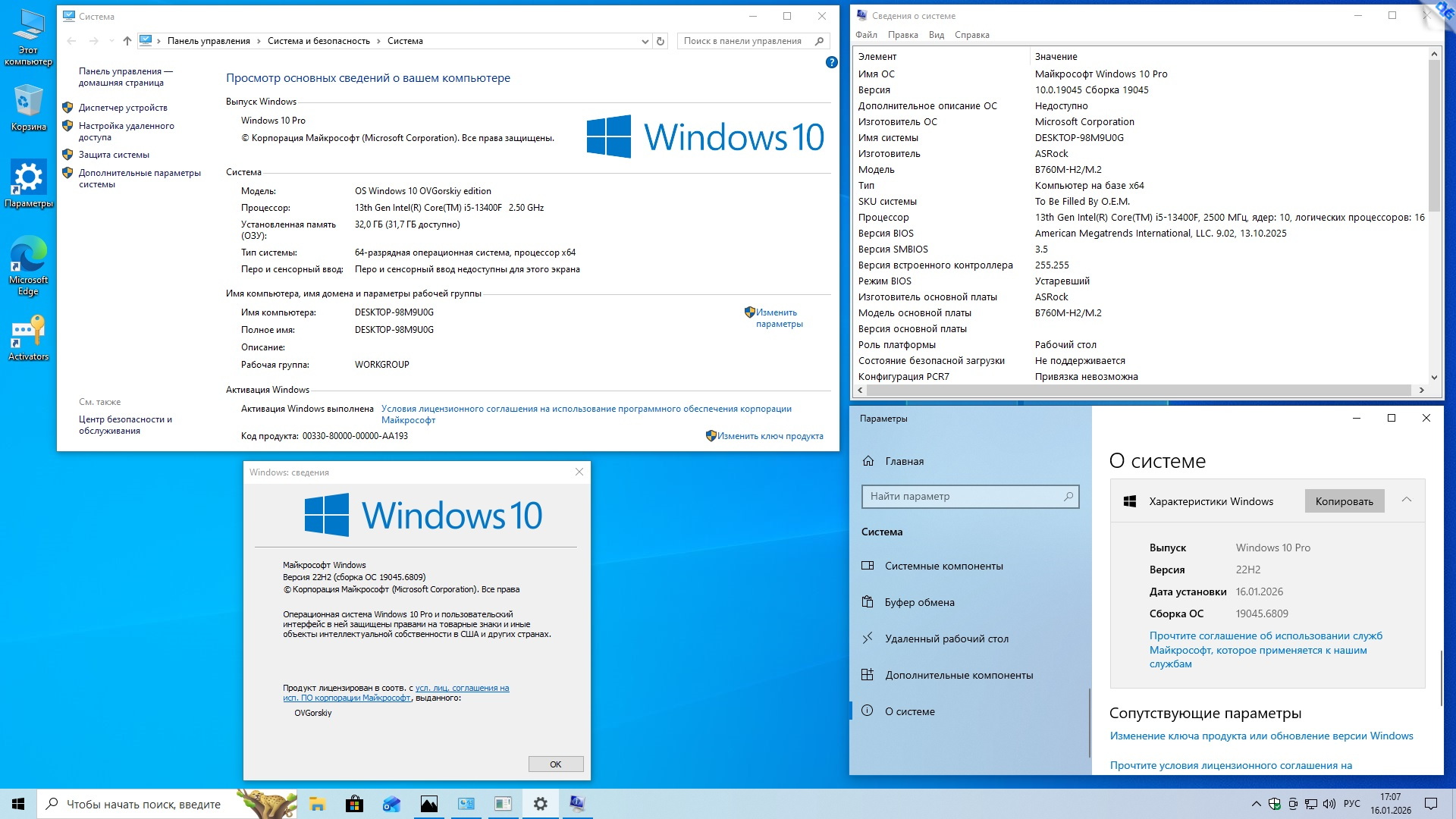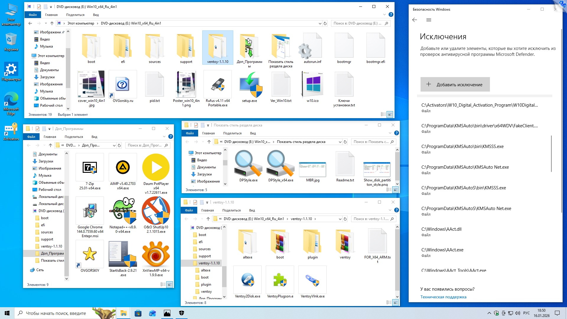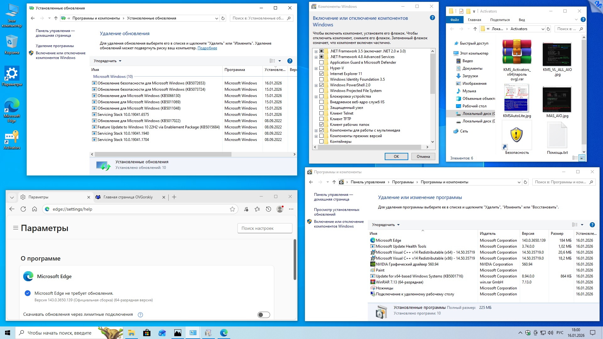 Microsoft® Windows® 10 x64 22H2 4in1 Upd 01.2026 by OVGorskiy Информация: Год выпуска: январь 2026 г. Версия: 10.0 build 19045 22H2 (10.0.19045.6809). Адрес оф. сайта: © Microsoft 2026 Автор сборки: by OVGorskiy Язык интерфейса: Русский Лекарство: в комплекте, KMS активатор или свой лицензионный ключ Системные требования: Процессор x64 с частотой 1 гигагерц (ГГц) или быстрее (рекомендуется 4 ядра и более). ОЗУ: 2 ГБ (рекомендуется 8ГБ и более). Место на жестком диске: 36 ГБ и более (желательно 64GB SSD). Видеокарта: DirectX 9 или более поздней версии с драйвером WDDM 1.0. Дисплей: 800 x 600 точек. Описание: немного настроенные, обновленные и максимально приближенные к оригинальным русским образам ОС "Windows® 10™" от Microsoft 64-х бит. разрядности и разных редакций, объединенных в 1 образ (x64) стандартными средствами от Microsoft ADK (DISM). Включает в себя обновлённые, почти "чистые", почти не модифицированные образы ОС Windows 10 Pro, Home и Enterprise x64 с интегрированным в загрузчик-установщик набором инструментов Microsoft Diagnostics and Recovery Toolset (DaRT10). В систему интегрированы только обновления по 13 января 2026 г. включительно и ссылка на сайт автора. Больше никаких крупных изменений не производилось. Сборка разработана для тех, кому необходима почти чистая система после установки, кому не нужны изменения в системе, а вопросами настройки, оптимизации и оформления готов заняться сам. Всё это предоставляет данная сборка, наиболее популярные редакции в сборке, почти чистая обновлённая система с минимальными изменениями и возможность работы с компьютером с загрузочного носителя для восстановления и работы с уже установленной системой. Название операционной системы: Microsoft® Windows® 10 22H2 Ru Версия ОС: 10.0 build 19045 (22H2) Update 01.2026 (10.0.19045.6809). Состав сборки: Core Home, Core Home Single Language, Professional, Enterprise. Канал распространения: Retail (VL для Корп.). Разрядность: 64 бит (x64). Дата выпуска: январь 2026 г. Сборка основана на официальных образах MICROSOFT MSDN: ru-ru_windows_10_consumer_editions_version_22h2_x64_dvd_86fd5014.iso ru-ru_windows_10_business_editions_version_22h2_x64_dvd_61849fe8.iso. Изменения в образе ОС: - Интегрированы обновления по 13 января 2026 г. накопительные; - Интегрированы компоненты .NetFramework 4.8.1 с обновлениями по январь 2026 г.; - Запущен компонент ОС .NetFramework 3.5 (2.0 и 3.0 включительно), требуется некоторым программам; - Удалена Кортана т.к. не работает в русской версии; - Произведена небольшая настройка конфиденциальности (отключены сбор и отправка отчётов); - Обновлён браузер Edge до новой версии Microsoft Edge 143.0.3650.139 Chromium; - Папка с активаторами и сами активаторы внесены в исключения Защитника Windows; - Устанавливаются библиотеки Microsoft Visual C++ v14 Redistributable 14.50.35719; - Устанавливается архиватор WinRAR v7.13; - Запущено создание точек восстановления на самом начальном этапе. ISO 64-х битный образ - Home Core (Домашняя) x64, - Home Core single language (Домашняя для одного языка) x64, - Professional (Профессиональная) x64, - Enterprise (Корпоративная) x64. Windows 10 x64 Ru 22H2 4in1 Upd 01.2026 by OVGorskiy.iso CRC32: 46071177 MD5: 45B3D165BE7E3A9A91EB4E9E07C79797 SHA-1: 775137409978BBFEEAE4F2E4D47FA08B68B8566C Размер 7,20 ГБ (7 737 769 984 байт). 1. Установка операционной системы ничем не отличается от установки операционной системы с оригинала. При запросе ключа установки нажмите, "у меня нет ключа" либо воспользуйтесь ключом установки из файла "Ключи установки.txt" в корне установочного образа. В самом начале установки нужно выбрать редакцию системы, которую вы хотите установить. Время установки ОС варьирует от 10 до 35 минут в зависимости от разрядности и мощности компьютера. 2. Содержимое образов можно перене