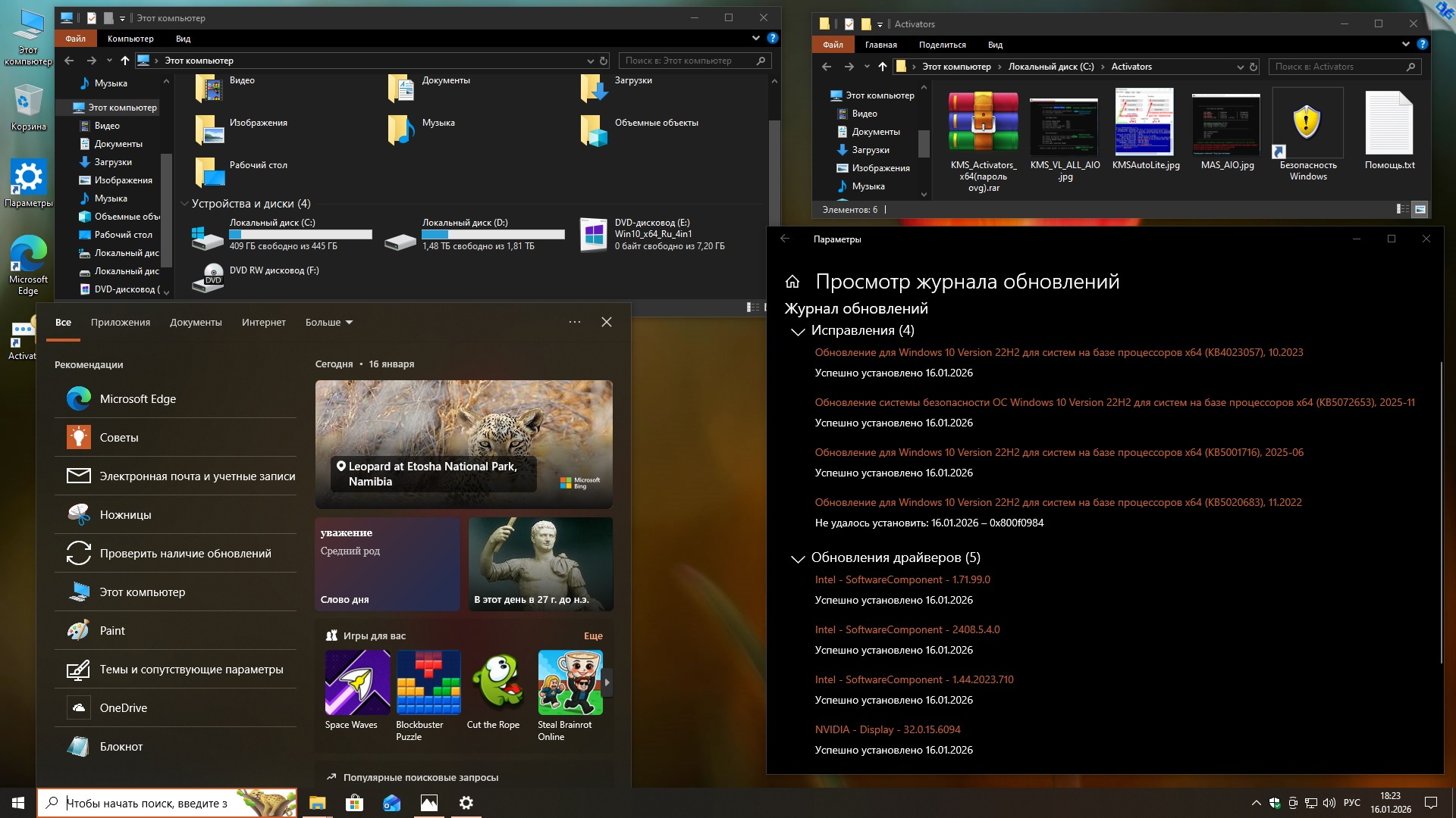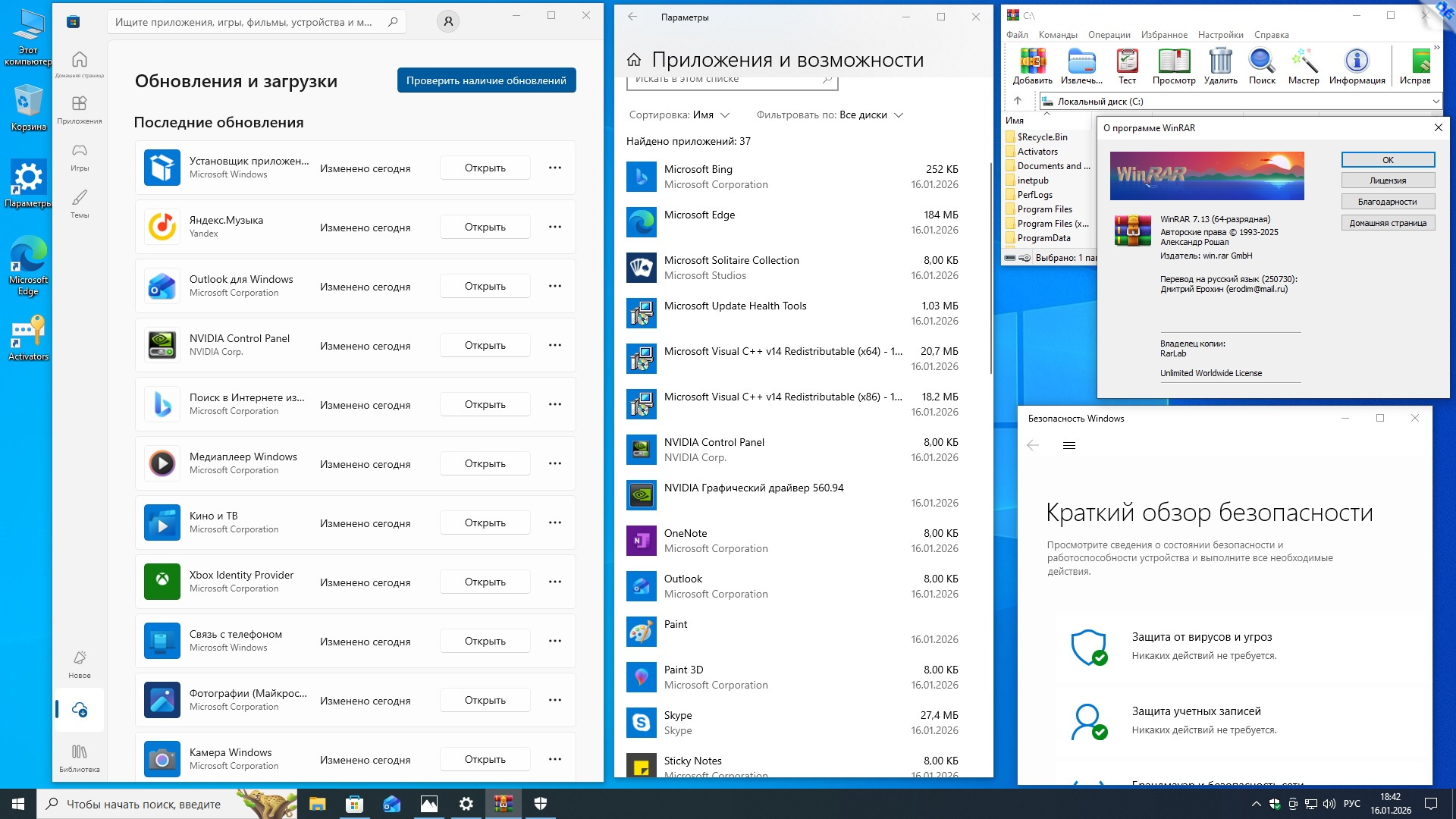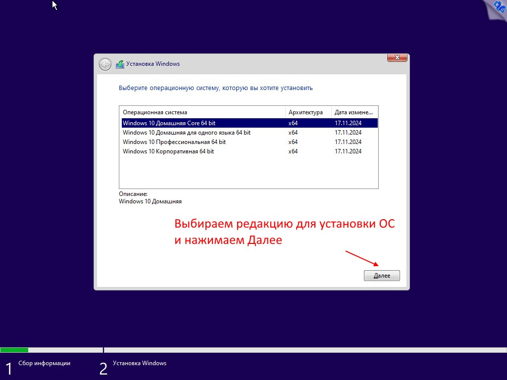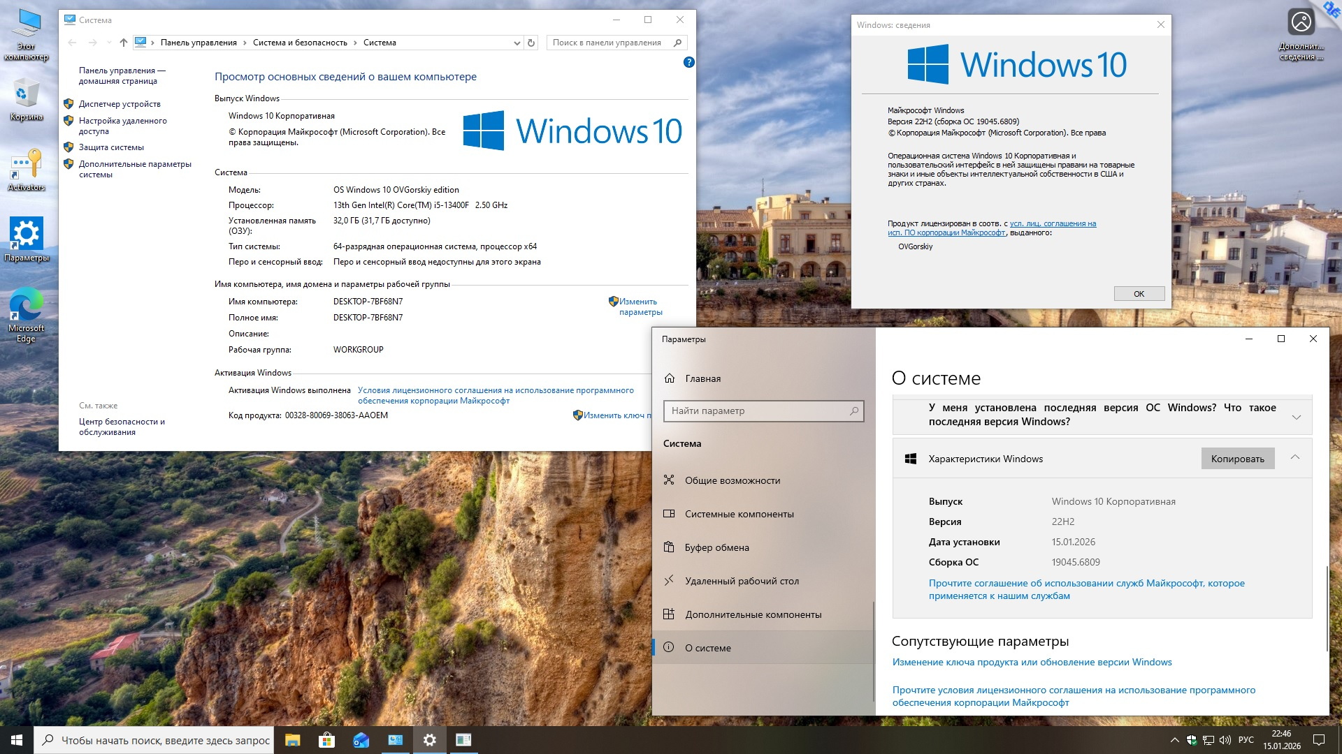 Microsoft® Windows® 10 x64 22H2 4in1 Upd 01.2026 by OVGorskiy Информация: Год выпуска: январь 2026 г. Версия: 10.0 build 19045 22H2 (10.0.19045.6809). Адрес оф. сайта: © Microsoft 2026 Автор сборки: by OVGorskiy Язык интерфейса: Русский Лекарство: в комплекте, KMS активатор или свой лицензионный ключ Системные требования: Процессор x64 с частотой 1 гигагерц (ГГц) или быстрее (рекомендуется 4 ядра и более). ОЗУ: 2 ГБ (рекомендуется 8ГБ и более). Место на жестком диске: 36 ГБ и более (желательно 64GB SSD). Видеокарта: DirectX 9 или более поздней версии с драйвером WDDM 1.0. Дисплей: 800 x 600 точек. Описание: немного настроенные, обновленные и максимально приближенные к оригинальным русским образам ОС "Windows® 10™" от Microsoft 64-х бит. разрядности и разных редакций, объединенных в 1 образ (x64) стандартными средствами от Microsoft ADK (DISM). Включает в себя обновлённые, почти "чистые", почти не модифицированные образы ОС Windows 10 Pro, Home и Enterprise x64 с интегрированным в загрузчик-установщик набором инструментов Microsoft Diagnostics and Recovery Toolset (DaRT10). В систему интегрированы только обновления по 13 января 2026 г. включительно и ссылка на сайт автора. Больше никаких крупных изменений не производилось. Сборка разработана для тех, кому необходима почти чистая система после установки, кому не нужны изменения в системе, а вопросами настройки, оптимизации и оформления готов заняться сам. Всё это предоставляет данная сборка, наиболее популярные редакции в сборке, почти чистая обновлённая система с минимальными изменениями и возможность работы с компьютером с загрузочного носителя для восстановления и работы с уже установленной системой. Название операционной системы: Microsoft® Windows® 10 22H2 Ru Версия ОС: 10.0 build 19045 (22H2) Update 01.2026 (10.0.19045.6809). Состав сборки: Core Home, Core Home Single Language, Professional, Enterprise. Канал распространения: Retail (VL для Корп.). Разрядность: 64 бит (x64). Дата выпуска: январь 2026 г. Сборка основана на официальных образах MICROSOFT MSDN: ru-ru_windows_10_consumer_editions_version_22h2_x64_dvd_86fd5014.iso ru-ru_windows_10_business_editions_version_22h2_x64_dvd_61849fe8.iso. Изменения в образе ОС: - Интегрированы обновления по 13 января 2026 г. накопительные; - Интегрированы компоненты .NetFramework 4.8.1 с обновлениями по январь 2026 г.; - Запущен компонент ОС .NetFramework 3.5 (2.0 и 3.0 включительно), требуется некоторым программам; - Удалена Кортана т.к. не работает в русской версии; - Произведена небольшая настройка конфиденциальности (отключены сбор и отправка отчётов); - Обновлён браузер Edge до новой версии Microsoft Edge 143.0.3650.139 Chromium; - Папка с активаторами и сами активаторы внесены в исключения Защитника Windows; - Устанавливаются библиотеки Microsoft Visual C++ v14 Redistributable 14.50.35719; - Устанавливается архиватор WinRAR v7.13; - Запущено создание точек восстановления на самом начальном этапе. ISO 64-х битный образ - Home Core (Домашняя) x64, - Home Core single language (Домашняя для одного языка) x64, - Professional (Профессиональная) x64, - Enterprise (Корпоративная) x64. Windows 10 x64 Ru 22H2 4in1 Upd 01.2026 by OVGorskiy.iso CRC32: 46071177 MD5: 45B3D165BE7E3A9A91EB4E9E07C79797 SHA-1: 775137409978BBFEEAE4F2E4D47FA08B68B8566C Размер 7,20 ГБ (7 737 769 984 байт). 1. Установка операционной системы ничем не отличается от установки операционной системы с оригинала. При запросе ключа установки нажмите, "у меня нет ключа" либо воспользуйтесь ключом установки из файла "Ключи установки.txt" в корне установочного образа. В самом начале установки нужно выбрать редакцию системы, которую вы хотите установить. Время установки ОС варьирует от 10 до 35 минут в зависимости от разрядности и мощности компьютера. 2. Содержимое образов можно перене