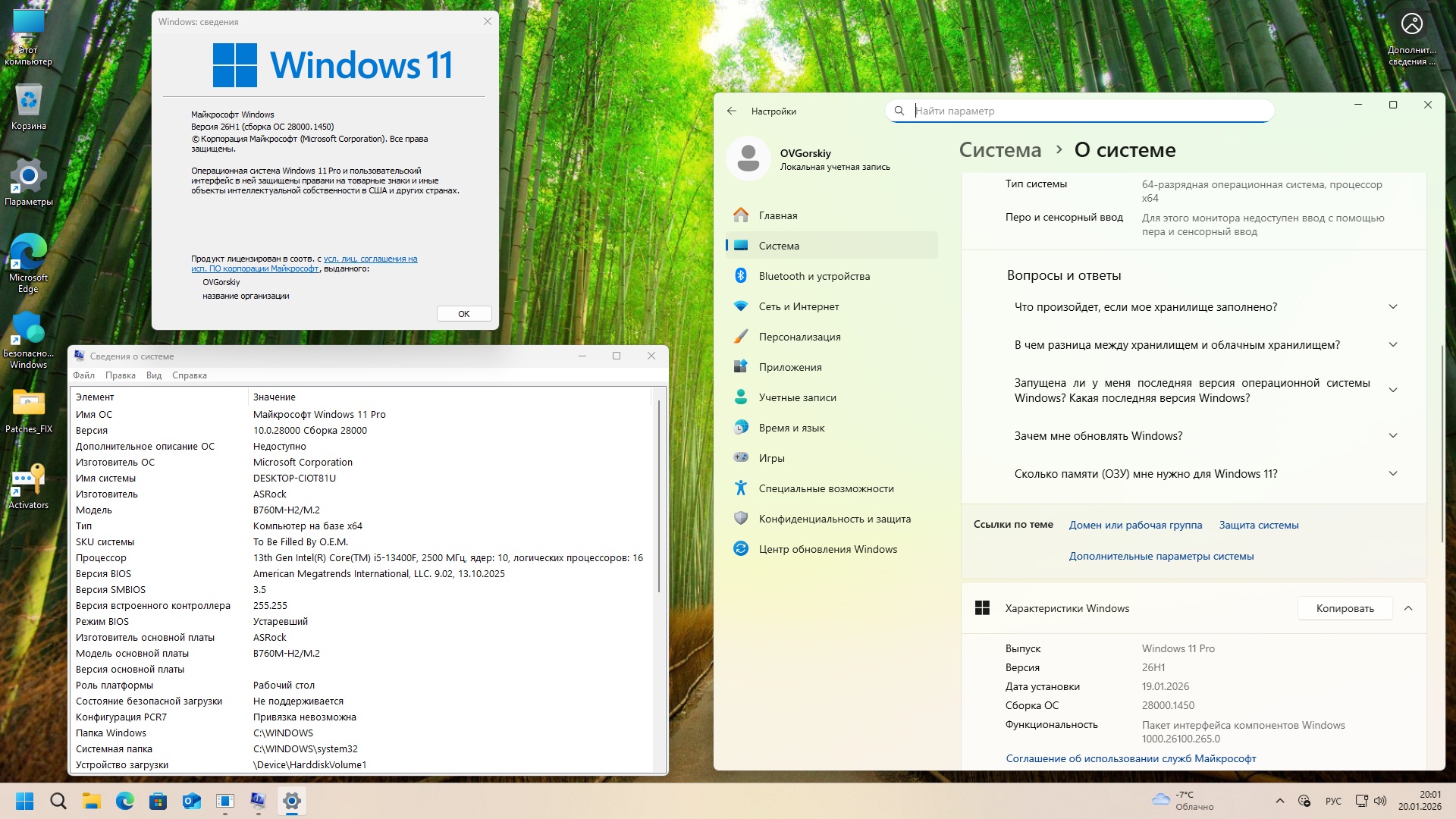 Microsoft® Windows® 11 Pro Prev x64 26H1 by OVGorskiy (ТЕСТ) 01.2026 [RU] Информация: Год выпуска: январь 2026 г. Версия: 10.0 build 28000 (26H1) 2026 Insider Preview (10.0.28000.1450). Адрес оф. сайта: © Microsoft 2026 Автор сборки: by OVGorskiy Язык интерфейса: Русский (Russian). Лекарство: в комплекте. KMS активатор или свои ключи активации (RET, OEM). Системные требования: ○ Современный двухъядерный процессор x64 (amd64) с частотой 1 гигагерц (ГГц) или быстрее с функцией SSE4.2; ○ ОЗУ: 4 ГБ (рекомендуется 8ГБ и больше); ○ Место на жёстком диске: 32 ГБ (рекомендуется SSD 64ГБ и больше); ○ Безопасность: UEFI, безопасная загрузка и модуль TPM 2.0 (обход); ○ Видеокарта: DirectX 12 или более поздней версии с драйвером WDDM 2.0; ○ Дисплей: 1366x768 точек. Описание: Тестовая сборка на основе обзорного предварительного образа новой версии операционной системы Windows 11 x64 (64 бит.) 26H1 от Microsoft Профессиональная. В сборке произведена небольшая оптимизация системы для более комфортной работы на не очень мощных компьютерах. Удалена в оптимальном режиме телеметрия и шпионские функции. Приостановлена работа не нужных служб. Удалены некоторые мало востребованные функции. Интегрированы накопительные обновления системы по январь 2026 и браузера Edge. В сборке произведена разблокировка установки на не поддерживаемых компьютерах по системным требованиям (кроме SSE4.2). Сборка предназначена для тех, кто желает оценить и протестировать систему новой предварительной версии. Сборка подвергалась минимальным изменениям и сохранила все свои необходимые функции. В сборке не обнаружено никаких серьёзных критических ошибок и вполне походит для основной эксплуатации. В сборке произведено разблокирование установки на не поддерживаемых компьютерах. Сборка основана на официальном UUP образе канала Insider Preview (Дата выпуска: январь 2026) Интегрированы: - обновление за январь 2026 г. (накопительное); - обновление .NET 4.8.1 за январь 2026 г. (накопительное); Автоматически устанавливаемая программа в процессе установки ОС: ○ Microsoft Edge 144.0.3719.82 Stable, обновление Edge системы; ○ Microsoft Visual C++ v14 Redistributable 14.50.35719, библиотеки C++; ○ Архиватор WinRAR v.7.13. Windows 11 x64 Pro Prev 26H1 Ru by OVGorskiy 01.2026 CRC32: 54138A1B MD5: 50AAEF9516F2D9E109D6336EB3EAB82D SHA-1: 21B160029C73BFFF5A6FC81E7E73BD13963FCBD5 - Установка операционной системы почти не отличается от установки с оригинала. В сборке произведена разблокировка обязательного требования MS по установке системы с подключенным интернетом и обязательной учётной записью Microsoft, обязательному наличию UEFI, безопасной загрузки и модуля TPM 2.0 (кроме SSE4.2). При установке рекомендуется отключить подключения к интернету физически. Будет возможность создать локальную учётную запись. Требуется только соответственно имя и, если требуется пароль. При подключенном интернете будет предложено создать учётную запись Microsoft. Время установки ОС меньше и варьирует от 10 до 25 минут в зависимости от мощности компьютера. Приложения устанавливаются методом post-install внутренним установщиком ОС. Содержимое образов можно перенести на загрузочную флешку по соответствующей процедуре по созданию загрузочных носителей. Сборка проверялась во всех вариантах установки на реальной машине с загрузочной флешки. Ошибок установки не обнаружено. Самый оптимальный вариант установки с флешки как наиболее быстрый и удобный. Для создания флешки наиболее простым способом является применение программ Ventoy или Rufus на компьютерах с дисковой структурой MBR (программы присутству