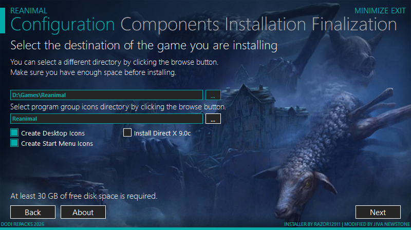 • БОЙТЕСЬ ВМЕСТЕ Никто не должен проходить через ад в одиночку! В REANIMAL можно играть в одиночном или в совместном режиме локально или по сети, а общая камера с направленным обзором повышает давящую клаустрофобию и напряжение. За основу взят релиз от RUNE (REANIMAL-RUNE) Версия игры: v354342 DLCs: 3954470=REANIMAL - Foxhead and Muttonhead Masks 4112550=REANIMAL - Season Pass НИЧЕГО не вырезано, НИЧЕГО не перекодировано Время установки 10 - 30 минут Язык изменяется в настройках игры Repack от DjDI 1- Запустите программу установки от имени администратора 2- Нажмите на страницу 3- Нажмите стрелку вверх на клавиатуре 4- Нажмите Установить 5- Нажмите Продолжить 6- Выберите пункт назначения установки 7- Нажмите Далее 8- Выберите компонент 9- Установить