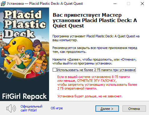 • Репак основан на ISO-образе Placid.Plastic.Deck.A.Quiet.Quest-TENOKE: tenoke-placid.plastic.deck.a.quiet.quest.iso (2,563,819,520 байт)