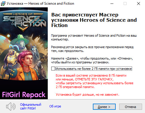 • Для установки репака требуется минимум 2 Гб свободной оперативной памяти (включая виртуальную)