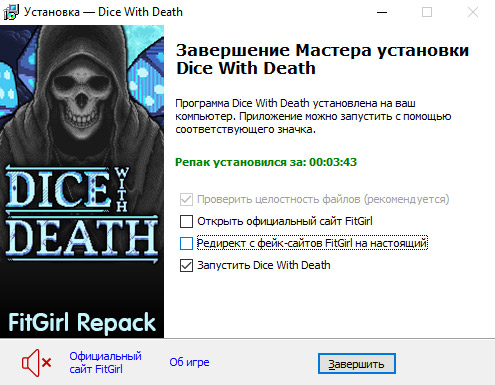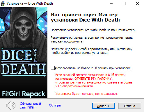 - Репак основан на ISO-образе Dice.With.Death-TENOKE: tenoke-dice.with.death.iso (3,547,299,840 байт)