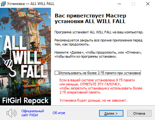 - Репак основан на ISO-образе ALL.WILL.FALL-RUNE: rune-all.will.fall.iso (2,948,464,640 байт)