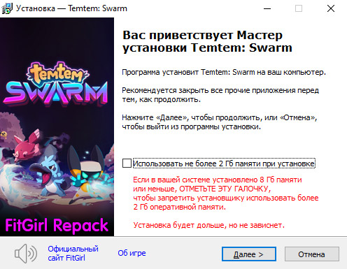 - Для установки репака требуется минимум 2 Гб свободной оперативной памяти (включая виртуальную)
