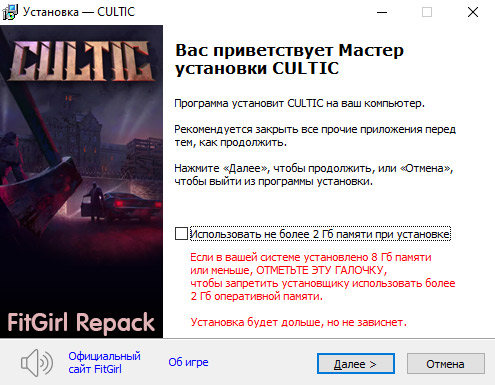 - Репак основан на ISO-образе CULTIC.Complete.Edition-TENOKE: tenoke-cultic.complete.edition.iso (9,885,063,168 байт)