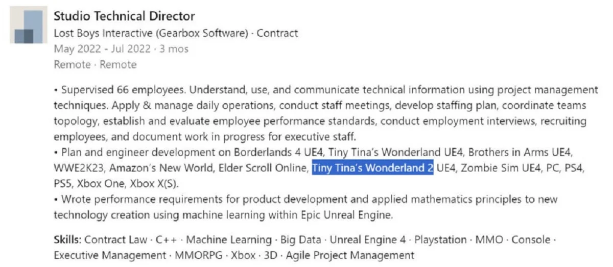 В профиле бывшего технического директора студии Lost Boys Interactive, которая помогала Take-Two и в частности Gearbox в работе над Tiny Tina’s Wonderlands, нашли упоминание Borderlands 4 и Tiny Tina’s Wonderlands 2. Игры якобы создаются на движке Unreal Engine 4.