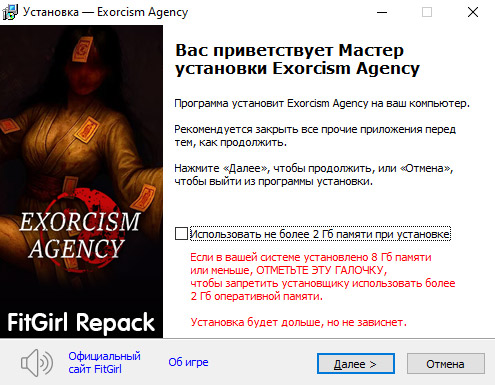 - Репак основан на ISO-образе Exorcism.Agency-TENOKE: tenoke-exorcism.agency.iso (9,316,349,952 байта)