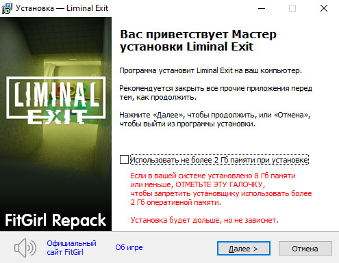 - Репак основан на ISO-образе Liminal.Exit-TENOKE: tenoke-liminal.exit.iso (4,870,852,608 байт)